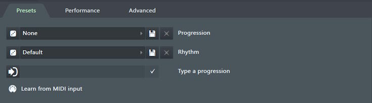 • Progression (прогрессия) — выбрать прогрессию из списка предустановок. Этот список подобран из популярных аккордовых последовательностей. Примечание: Если у тебя больше или меньше 4 аккордов, 4-аккордная предустановка будет повторяться на равных интервалах времени. Повторяющиеся блоки идут по (4 x Length (длина)). Для дополнения предустановленных аккордов будут созданы дополнительные аккорды, а если доступных аккордов слишком мало, некоторые из предустановленных аккордов будут пропущены..