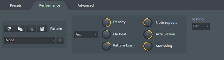 • Переключатель паттернов (левее крестика) – служит отправной точкой для (пере)генерации исполнения, а также обновляет значения ручек параметров. Примечание: Если выбран паттерн типа Arp (арпеджио) или Chop (разделение), он будет отрисован как есть, без применения параметров справа. При нажатии Regenerate (сгенерировать заново) или изменении ручек, параметры будут применены и паттерн изменится соответствующим образом.