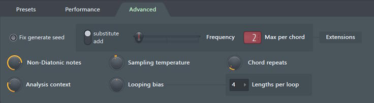 • Non-Diatonic notes (внеладовые ноты) — увеличение этого значения поощряет генерацию аккордов (и дополнительных нот), выходящих за пределы выбранной гаммы.