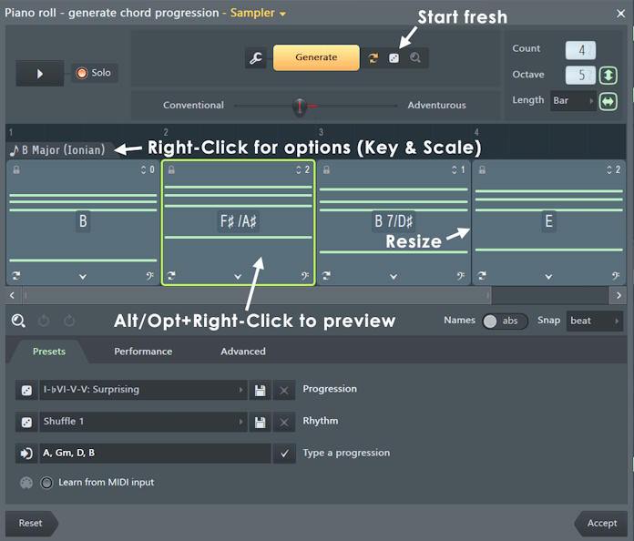 • Ползунок Conventional-Adventurous (традиционно-экспериментально) — двигайте влево для более «классических» прогрессий с меньшим количеством добавленных или изменённых нот. Будет больше нот внутри гаммы и больше согласованности. Двигайте вправо — для более экспериментальных прогрессий с добавленными нотами, нотами вне гаммы и менее предсказуемыми переходами. Совет: Передвиньте ползунок максимально вправо, если вы сочиняете саундтрек к приключениям белки на кофеине.