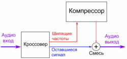• Компрессия разделённых полос: здесь сигнал разделяется на два частотных диапазона, первая часть диапазона содержит только чрезмерно шипящие частоты, а вторая часть — все остальные. Сигнал, содержащий шипящие частоты, посылается на компрессор, а другой частотный диапазон не обрабатывается. После прохождения обработки два частотных диапазона смешиваются обратно в один сигнал. Исходный сигнал может быть разделён на высокие (шипящие) и низкие частоты или же таким образом, что частоты выше и ниже шипения не будут затронуты. Этот метод похож на многополосную компрессию.