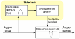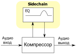• Сайдчейн компрессия или широкополосный деэссер: при этом способе сигнал подаётся по боковой цепи компрессора, отфильтрованный так, чтобы оставить только шипящие частоты. В результате компрессор сжимает сигнал только при наличии высокого уровня шипения. Этот метод сжимает весь диапазон частот, поэтому в деэссерах данного типа параметры атаки и восстановления чрезвычайно важны, и параметр порога не может быть установлен очень низко, как в других видах деэссеров, так как возможно появление очень заметных артефактов.