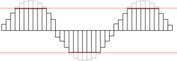 - Потому как клиппированный сигнал имеет большую площадь пиков, чем максимальный не клиппированный, усилитель производит больше мощности (см. пример кривой справа). Эта дополнительная мощность может привести к повреждению компонентов колонок, в том числе низкочастотных, высокочастотных динамиков или кроссоверов, в следствии перегрева.