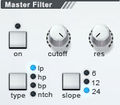 «Master Filter» – его работа заключается в фильтрации звука, а именно пропускании одних частот в срезе других. Кнопка «on», которая по дефолту выключена, чуть правее «cutoff» – частота среза фильтра и «res» – резонанс фильтра на частоте среза cutoff. Чуть ниже находятся две кнопки, позволяющие переключать «type» - тип фильтра (lp – lowpass, hp – highpass, bp – bandpass, ntch – notch, и slope – наклон, составляющий 6, 12, 24 dB. Немного про наклон, чтобы было понятнее. Отношение, по которому звуковая волна уменьшена выше частоты среза, определяется наклоном фильтра. Если Вы имеете фильтр 6dB на октаву, он уменьшит уровень источника звука на 6dB на одну октаву выше точки среза, на 12dB в двух октавах выше частоты среза, на 18dB в трех октавах выше частоты среза.