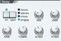 «Delay» – эффект задержки и повторения звукового сигнала в определенном количестве и времени. кнопки «on» и «type». Последняя делится на: «mono» и «stereo» – думаю, объяснять не нужно; «cross» – правый и левый канал меняются в свободном порядке; «pngpg» – ping-pong – звук балансирует между левым и правым каналом. Далее «mix» - отвечает за смешивание прямого и задержанного во времени сигналов; «mod» – modulation – модуляция; и внизу «time» – время задержки; «f-back» - определяет количество сигнала который будет подаваться обратно на вход (обратная связь); «lo-cut» - подрезка низких частот; «hi-cut» – подрезка высоких частот.