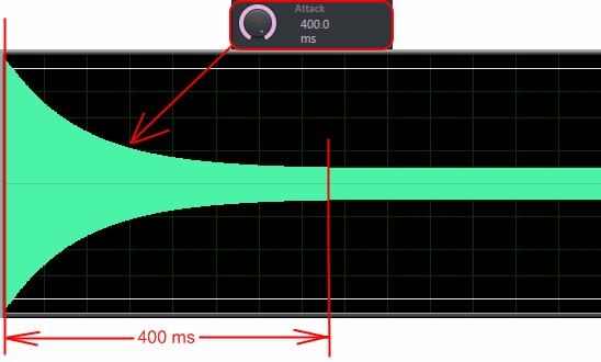 Откройте паттерн 4 и прослушайте, его громкость равна -20дб, далее откройте канал на который послан звучащий инструмент и настройте параметр Attack = 100мс (миллисекунд). И заново прослушайте звучание инструмента. В самом начале у него появится "звон" (как будто удар по струне) и далее он будет звучать примерно на уровне -20дб. После этого настройте параметр Attack = 400мс, и заметьте звук стал затухать дольше (см. рисунок ниже).