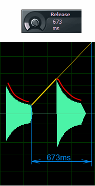 Первый рисунок (жёлтая линия) это график уменьшения сжатия со временем. Здесь отмена сжатия происходит практически мгновенно и следующий звук начинает компрессироваться по новой. Второй рисунок со значением Release = 673. Компрессор очень долго отменяет сжатие, и второй звук начинает звучать не с новой силой, а с остатками компрессии предыдущего звука. Если расстояние между звуками будет больше 673ms (пример на паттерне 9), то компрессия применится по новой.