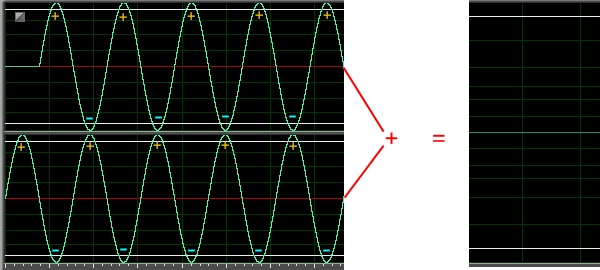 Напомним, что при переводе стерео сигнала в моно, складываются правый и левый каналы, и если в сигнале присутствуют противофазы (как на рисунке ниже) в результате складывания эти сигналы пропадут.