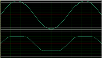 Сверху - необработанная синусоида, снизу - обработанная софтклиппером с порогом -6