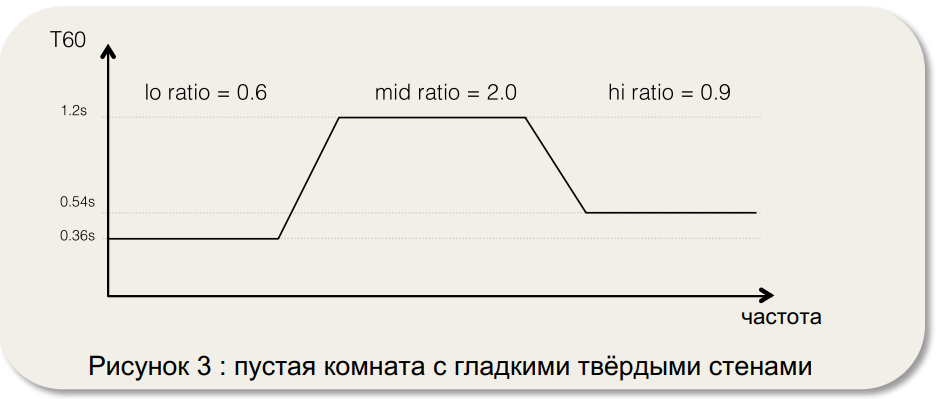 Частотно-временной график реверберации в пустой комнате с гладкими твёрдыми стенами
