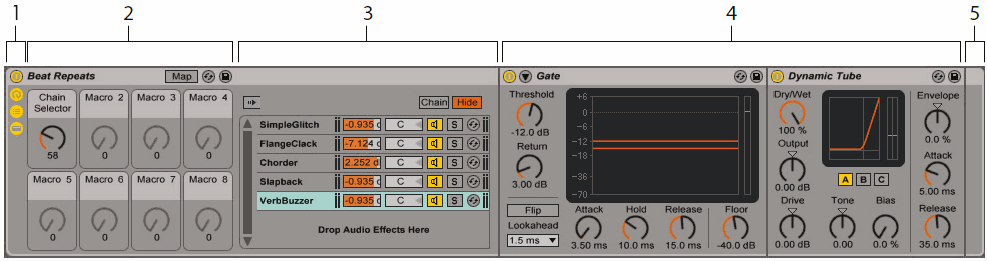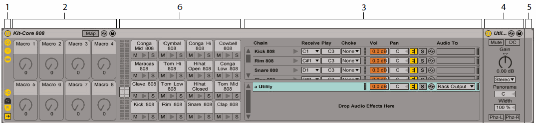 - Стойки имеют различные внешние виды, по мере необходимости их элементы могут быть показаны или скрыты. Каждая стойка в своём левом краю имеет колонку включателей соответствующие окон её различных элементов. Доступные включатели окон различаются в зависимости от использования Instrument Rack, Drum Rack или Effect Rack.