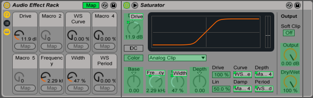 Обратите внимание, что после назначения параметра на макрос, этот параметр в устройстве будет отображаться отключенным, потому как он передаёт всё управление макросу (хотя он все ещё может быть внешне модулированным, через огибающую клипа).