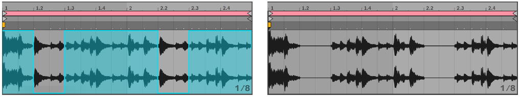 Обратите внимание, что настройки варпинга определяют, насколько точно движок Live искажает во времени форму огибающей трека. Для получения более прямого реагирования, снизить значение Grain Size в режиме Tones or Texture или выберите меньшее значение для Granulation Resolution в режиме Beats.