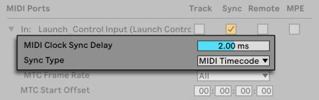Параметры Timecode могут быть установлены в MIDI устройстве. Для доступа к настройкам выберите MIDI-устройство из списка MIDI Ports в настройках Link/Tempo/MIDI.