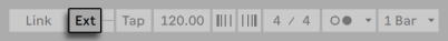 При включении внешнего источника синхронизации, в панели управления появляется кнопка EXT. Вы можете активировать внешнюю синхронизацию либо путём включения этой кнопки или с помощью команды External Sync из меню Options. Когда Live будет получать сообщения синхронизации, то рядом с кнопкой EXT будет мигать верхний индикатор.