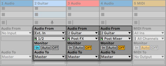 Что касается мониторинга, то установите Monitor на треке гитары в In, потому как мы всегда хотим слышать нашу гитару через этот трек, независимо от происходящего в Live. Остальные кнопки Monitor треков установите в Off.