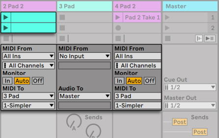 Мы могли бы быть обеспокоены тем, что отключение трека пэда (выключение его переключателя Activator) также отключает и другие MIDI треки. Если быть точным, то другой трек продолжает воспроизведение, но его MIDI проигрывают тот инструмент который в миксе. Это можно легко исправить путём разрезания клипов трека пэда и вставив их в третий трек, который может быть независимо отключен (и который может содержать свои собственные MIDI-эффекты). Оригинальный трек пэда в настоящее время выступает в качестве простого контейнера инструмента. Потому как мы не записываем новые клипы в этот трек, мы можем установить его меню Input Type в No Input, в результате чего кнопка активации записи на нём исчезает и поможет избежать путаницы при скрытом разделе In/Out микшера.