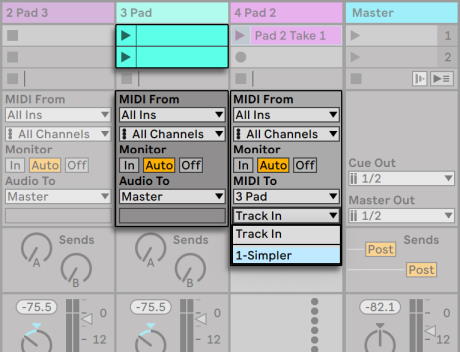 Это достигается путём установки меню Output Type нового MIDI трека на Pad. Обратите внимание, что меню Output Channel теперь предлагает широкий выбор направлений: Мы можем либо подавать выход нового трека на вход трека пэда, либо мы можем напрямую обращаться к Simpler. Опция Track In в меню Output Channel представляет собой входящий сигнал трека пэда (сигнал, который будет записан), который не тот что мы хотим. Вместо этого мы выберем Simpler Ch. 1 для отправки MIDI новых треков непосредственно на Simpler, минуя этапы записи и мониторинга. С помощью этой установки, мы можем выбрать для записи любой новый трек и все они будут проигрывать тот же звук клавиатуры.