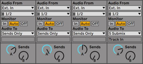 Третья возможность заключается в использовании для субмикширования Rturn треков Live. Это можно сделать, выбрав опцию Sends Only (только посыл) из меню Output Type трека, затем повернув контроллер Send как хотелось бы. Соответствующий Rturn трек будет выступать в качестве субмикшеруемого канала.
