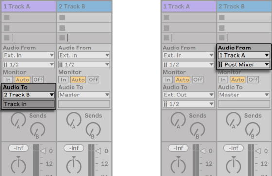 1. Track A установлен для отправки выходящего сигнала на Track B. Это возможно, потому что каждый трек, который может получить входящий сигнал соответствующего типа от Track A, отображается в его меню Output Type.