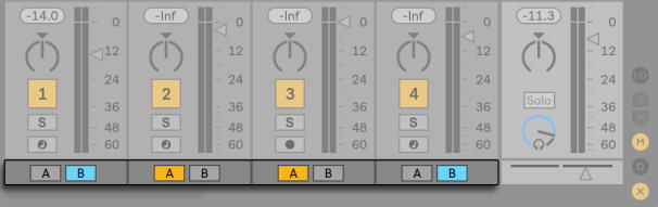 Каждый трек имеет две кнопки Assign Crossfade (назначение кроссфэйда) А и В. Трек может находиться в трёх состояниях по отношению к кроссфейдеру: