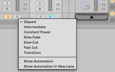 Кроссфейдер доступен из микшера окна сессии. Он включает в себя семь различных кривых кроссфейдера, так что вы можете выбрать ту, которая лучше всего подходит к вашему стилю. Чтобы изменить кривую нажмите правой кнопки мыши (PC)/Ctrl+левая кнопка мыши (Mac) по кроссфейдеру, а затем выберите пункт из контекстного меню.