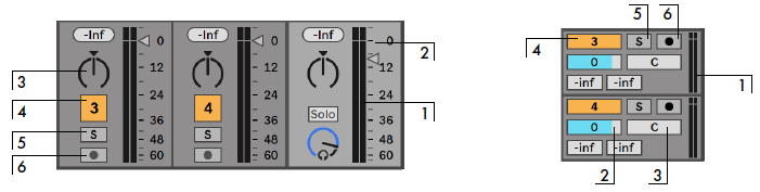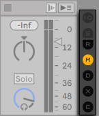 6. Arm Recording (активация записи) - при включении этой кнопки, на треке включается запись. При выборе нескольких треков, нажатие по любой из их кнопок, активирует запись на всех выбранных треках. В противном случае, запись может быть активирована только на одном треке за раз, если при нажатии не удерживается нажатой клавиша Ctrl (PC)/Command (Mac) или выключена опция Exclusive Arm в настройках Record/Warp/Launch. С включенной опцией Exclusive Arm, вставка инструмента на новый или пустой MIDI трек будет автоматически активировать запись на треке.