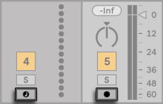 • Чтобы постоянно мониторить вход трека, независимо от того установлен ли он на запись или проигрывает клипы, выберите In. Этот параметр эффективно превращает трек в то, что называется Aux в некоторых системах: трек не используется для записи, но используется для привлечения сигнала из других источников. При помощи этой настройки, выход из клипа подавляется. Установка мониторинга в In может быть легко узнаваема даже тогда, когда раздел In/Out скрыт с помощью оранжевого цвет активатора трека.