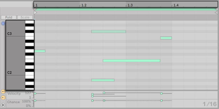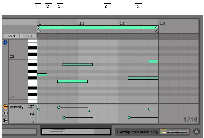 5. Обзор клипа находящийся прямо под MIDI-редактором также может быть использован для навигации. Он всегда показывает полное содержимое выбранного MIDI-клипа. Чёрный прямоугольный контур представляет собой часть клипа, которая отображается на данный момент в редакторе выше. Для прокрутки, щёлкните внутри контура и перетащите влево или вправо, чтобы увеличить или уменьшить масштаб, перетащите вверх и вниз.
