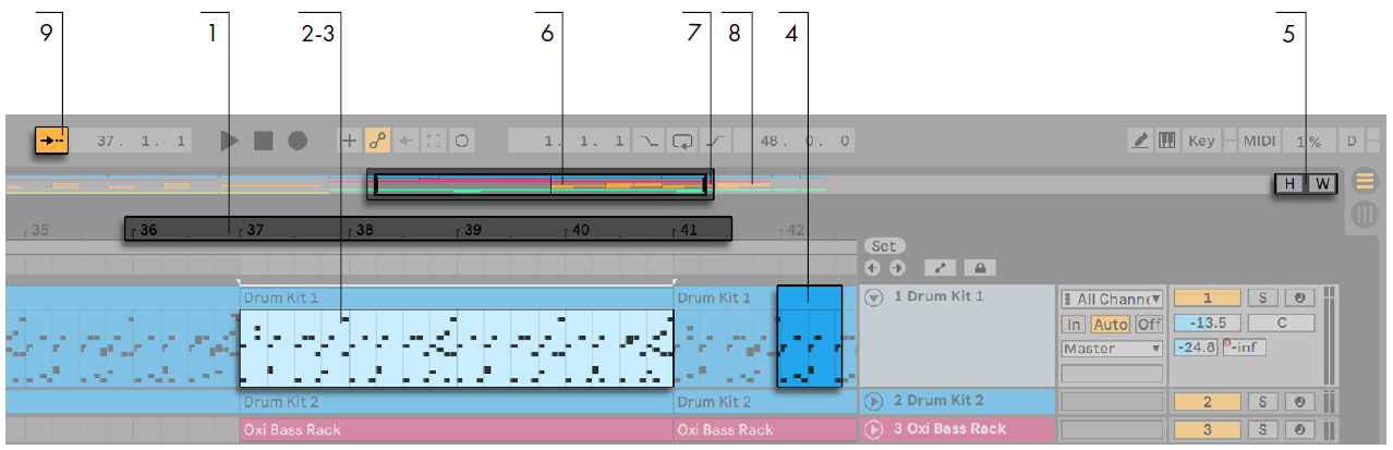 Live предлагает несколько методов для быстрого масштабирования и прокрутки дисплея аранжировки: