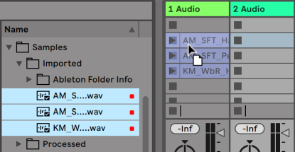 Если вы перетаскиваете несколько клипов в свой сет, Live по умолчанию размещает их на одном треке; вертикально в окне сессии или по горизонтали в окне аранжировки. Удерживайте нажатой [CTRL] (ПК) / [CMD] (Mac) перед их сбрасыванием, чтобы вместо этого разместить клипы на нескольких треках.