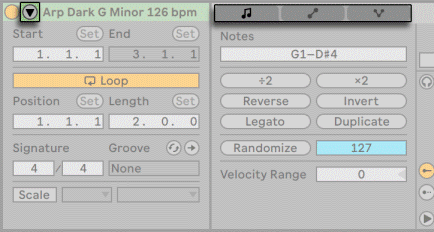 • Закладка Notes (ноты) содержит параметры, относящиеся к тому как Live проигрывает MIDI клипы, а также набор инструментов для преобразования нот в клипе.