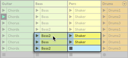 Свойств более чем одного клипа могут быть отредактированы коллективно в множественном окне клипов. Чтобы создать множественное-выделение, нажмите и перетащите из пустого слота клипа в сессии, это выделит клипы, или выберите клипы по одному используя клавишу Ctrl (PC)/Command (Mac) или клавишу Shift, что добавит другие клипы к вашему выделению. Свойства доступные в окне клипов при множественном-выделении зависят от содержания клипов, как правило показываются только те свойства, которые являются общими для всех выделенных клипов.