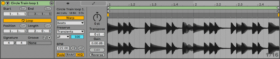 • Сэмпл отображается в том же дисплее, что и редактор огибающей с правой стороны окна клипа, здесь же находятся и элементы управления варпингом сэмплов Live и параметры воспроизведения клипа.
