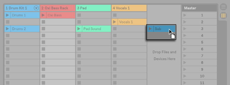 • Файлы можно перетаскивать из браузера на треки сессии или аранжировки. При перетаскивании материала из браузера в пространство справа от треков сессии или ниже треков аранжировки создастся новый трек содержащий в себе новый клип(ы).