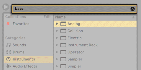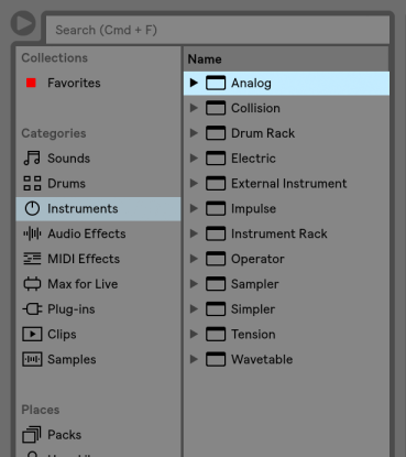 • Instruments (инструменты) - все ваши Instrument Racks, а также "сырые" инструменты Live и их пресеты, организованные в соответствии с устройствами (а не по типу звука).