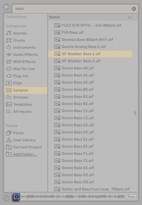 При включенной кнопке Raw (сырой), файлы прослушивается с их исходным темпом и не будет зациклен. При выключенном Raw, Live старается прослушать файлы в синхронизации с текущим Live сетом, так чтобы вы могли лучше судить о том, какие сэмплы будут лучше для вас работать. Обратите внимание, что если кнопка Raw включена, то перемотка невозможна.
