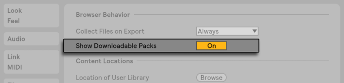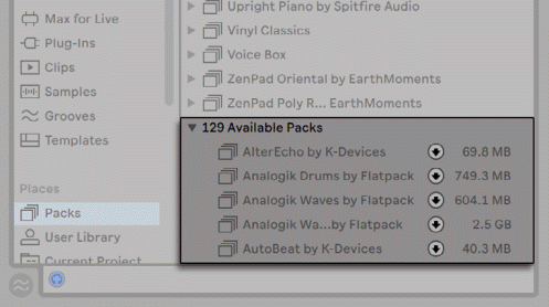 • Packs (пакеты) - все предварительно установленные пакеты, которые поставляются с Live, а также любые другие, которые вы установили сами. Каждый пакет в панели содержимого отображается в виде папки, которая может быть развёрнута, чтобы отобразить содержимое пакета. В ярлыке Packs также отображаются обновления для установленных пакетов, а также дополнительные пакеты, которые вы можете установить. Пожалуйста, обратитесь к разделу Загрузка и установка пакетов в браузер (см. раздел ниже) для получения дополнительной информации.