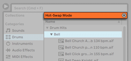 В дополнение к методу загрузки файлов из браузера с помощью перетаскивания и отпускания, Live предлагает режим горячей замены, который спасает вас от путешествия мыши. Режим горячей замены можно включить и выключить с помощью клавиши Q, этот режим создаёт временные связи между браузером, и например виртуальным инструментом. При использовании режима горячей замены, вы можете пройти через сэмплы или пресеты для их прослушивания "на месте", то есть в пределах этого инструмента. Горячая замена для пресетов описана в статье Использование устройств Live. Давайте рассмотрим пример горячей замены сэмплов: