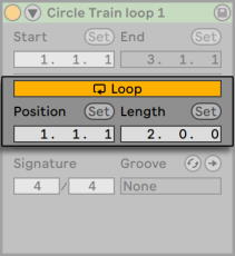 • Запустите воспроизведение клипа, а затем нажмите на кнопку Set у Position, это переместит начальную скобку лупа в текущую позицию воспроизведения (с округлением до глобального параметра квантования) и включит луп. Затем, нажмите на кнопку Set у Length, что переместит конечную скобку лупа в текущую позицию воспроизведения. Это позволяет захватывать музыку в лупы на лету.