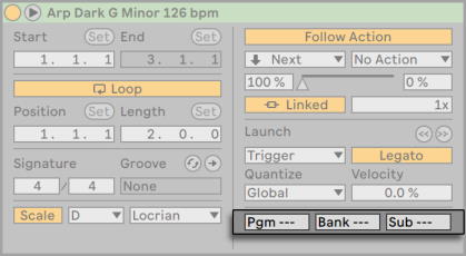 В MIDI-клипах нажатие треугольной кнопки-переключателя в строке заголовка окна «Клип» открывает настройки, позволяющие Live отправлять сообщения об изменениях MIDI банка/программы на внешние устройства и плагины, поддерживающие MIDI сообщения об изменении программы. В соответствии с настройками в этих элементах управления, запуск клипа также посылает сообщение о смене банка/программы. Если вы используете Live для отправки MIDI на ваш синтезатор, это означает, что каждый MIDI клип в Live сете может воспроизводить различные звуки на синтезаторе. Live предлагает сообщения для 128 банков со 128 под-банками, каждый из которых имеет 128 программ. Пожалуйста, просмотрите документацию, прилагаемую к вашему синтезатору, чтобы определить, сколько из этих сообщений он может использовать. Пожалуйста, обратитесь к документации, поставляемой вместе с синтезатором, чтобы определить, какое количество этих сообщений, он может использовать. Если вы не хотите, чтобы ваш клип отправлял сообщения об изменении программы или банка, просто установите переключатели Bank/Program в ---.