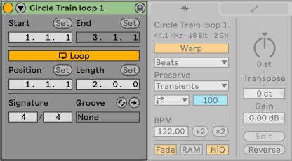 Для того, чтобы клип проигрывался как луп (потенциально бесконечно), включите переключатель Loop. Обратите внимание, что для аудиоклипов до переключателя Loop должен быть активирован переключатель Warp, иначе он недоступен, потому как не варпленные клипы не могут быть зациклены.