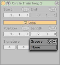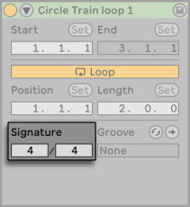 Используя поле Clip Signature клипа, вы можете указать тактовый размер MIDI или аудио клипа. Этот параметр имеет значение только для отображения, он не влияет на воспроизведение. Обратите внимание, что Clip Signature полностью отделено от тактового размера проекта, и может быть установлено независимо для каждого клипа. Это позволяет легко создавать сложные многомерные текстуры, путём одновременного запуска клипов с разными размерами и/или длинами зацикливаний.