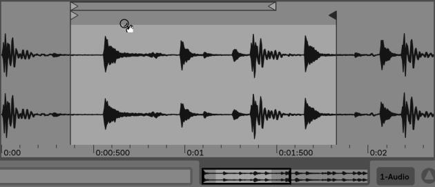 Масштабирование и прокрутка дисплея сэмпла/нотного редактора работает так же, как и в аранжировке. Для аудиоклипов, при отключенном варпинге, масштабирование и прокрутка могут быть сделаны в любом месте верхней половины окна отображения сэмпла. Однако при включенном варпинге, прокрутка происходит только во временной тактовой шкале и нижней части волны.
