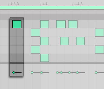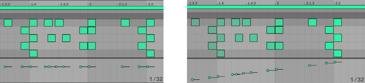 При нажатии клавиши [CTRL] (ПК) / [CMD] (Mac) вертикальные перемещения в режиме рисования изменяют велосити. Это означает, что одним движением по горизонтали и одним движением по вертикали вы можете рисовать несколько нот и их велосити, не отпуская кнопку мыши. Если вы измените велосити с помощью этого вертикального движения, Live запомнит это изменение и будет использовать вашу новую велосити на всех нотах, которые вы рисуете позже.