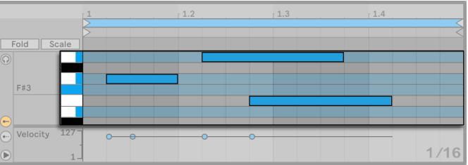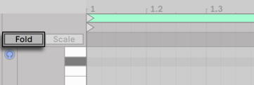 Важная особенностью MIDI-редактора это кнопка Fold (свернуть), расположена она в левом верхнем углу. Активизация этой кнопки сразу же скрывает все строки, или нотные дорожки, которые не содержат MIDI нот во всех клипах на выбранном треке. Это означает, что доступные нотные дорожки в каждом клипе вашего сета будут отличаться в зависимости от того, какие ноты присутствуют в этом клипе.