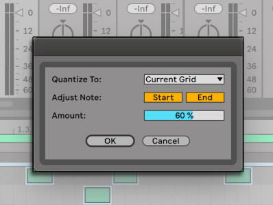 Используя представленные здесь опции, вы можете выбрать либо текущий размер сетки (Сurrent grid) либо конкретное значение размера для квантования, а также должны установить должны ли квантоваться либо начало либо конец ноты (либо оба). Квантование конца ноты растянет или сократит её, чтобы она заканчивалась в выбранном подразделе размера. Вы также можете квантовать без этой ощущаемой "квантованости" звука, регулируя параметр Amount (количество), который будет перемещать ноты в процентах от установленного значения квантования.