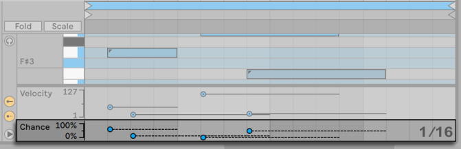 Чтобы изменить вероятность для MIDI ноты, щёлкните и перетащите соответствующий маркер в редакторе вероятности. Вы можете перетащить маркер вероятности ноты вверх и вниз, чтобы изменить значение вероятности от 0 до 100%. (Чтобы помочь вам найти маркер вероятности, принадлежащий MIDI-ноте, которая может быть наложена вертикально на другие, Live выделяет маркер вероятности для любой ноты, над которой находится указатель мыши). Изменения вероятности будут отображаться в числовом виде в заголовке дорожки редактора вероятностей.