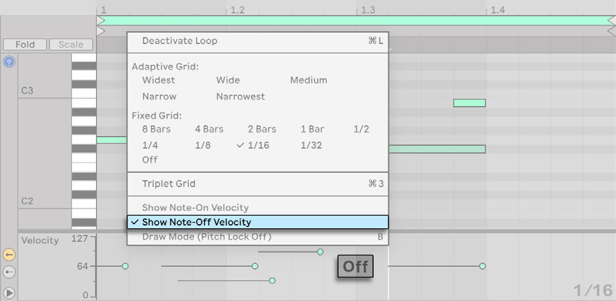 По умолчанию, редактор велосити позволяет настраивать on-велосити нот (велосити нажатия клавиши). Но вы можете переключить редактор для отображения, off-велосити нот (велосити отпускания клавиши) с помощью опции из контекстного меню редактора вызываемого нажатием правой кнопки мыши (PC)/Ctrl+левая кнопка мыши (Mac).