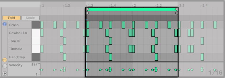 Если функция Fold отключена на треке, содержащем Drum Rack, редактор MIDI нот отображает только нотные дорожки которые принадлежат пэдам со звуками на них. Если Fold активировано, отображаются только дорожки, содержащие ноты.